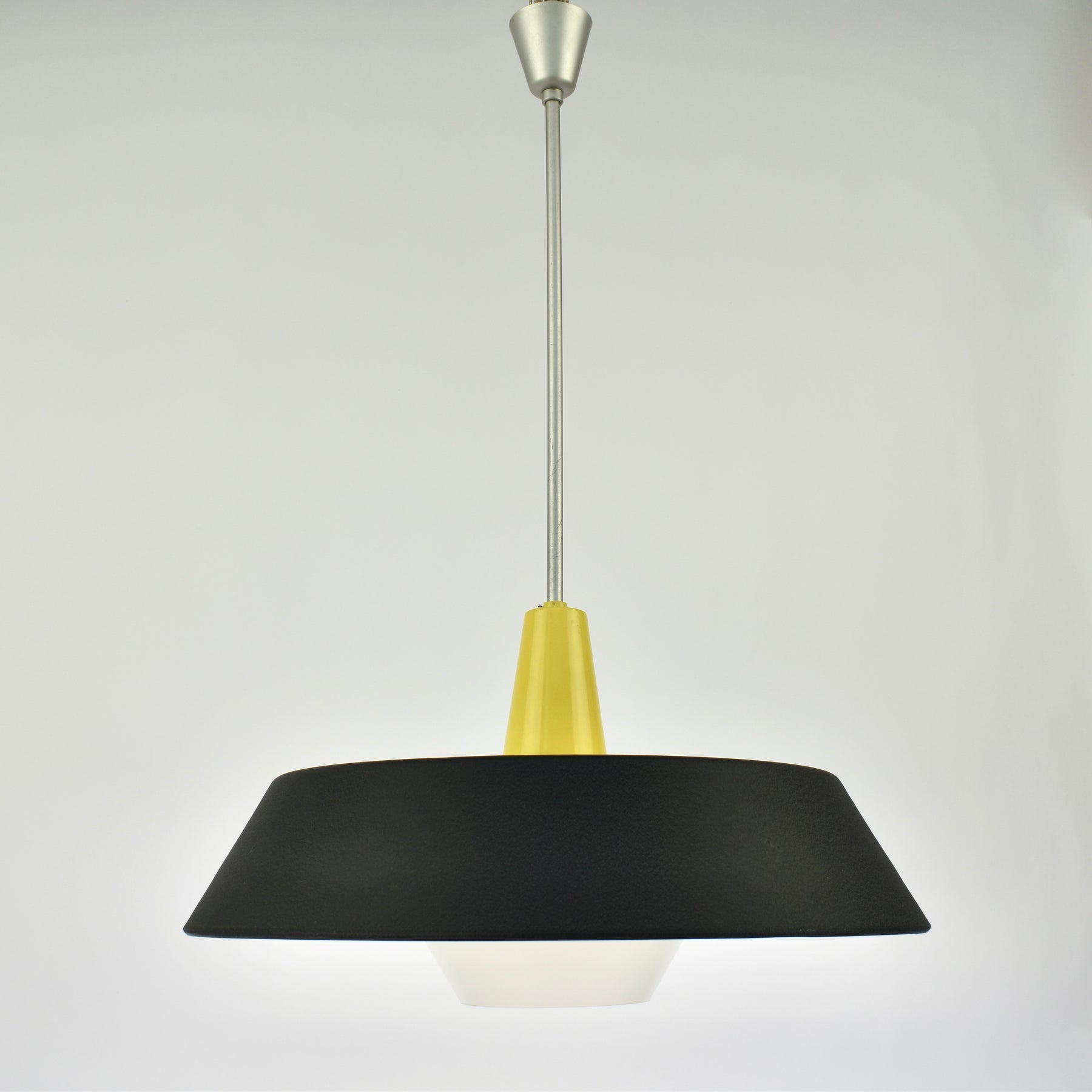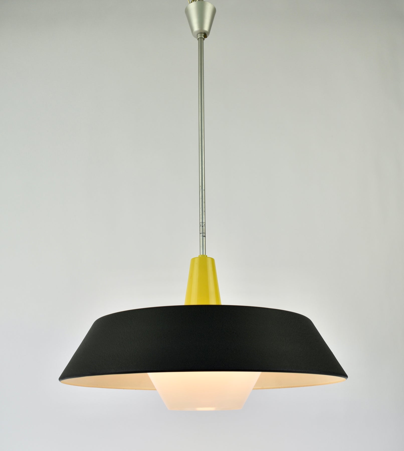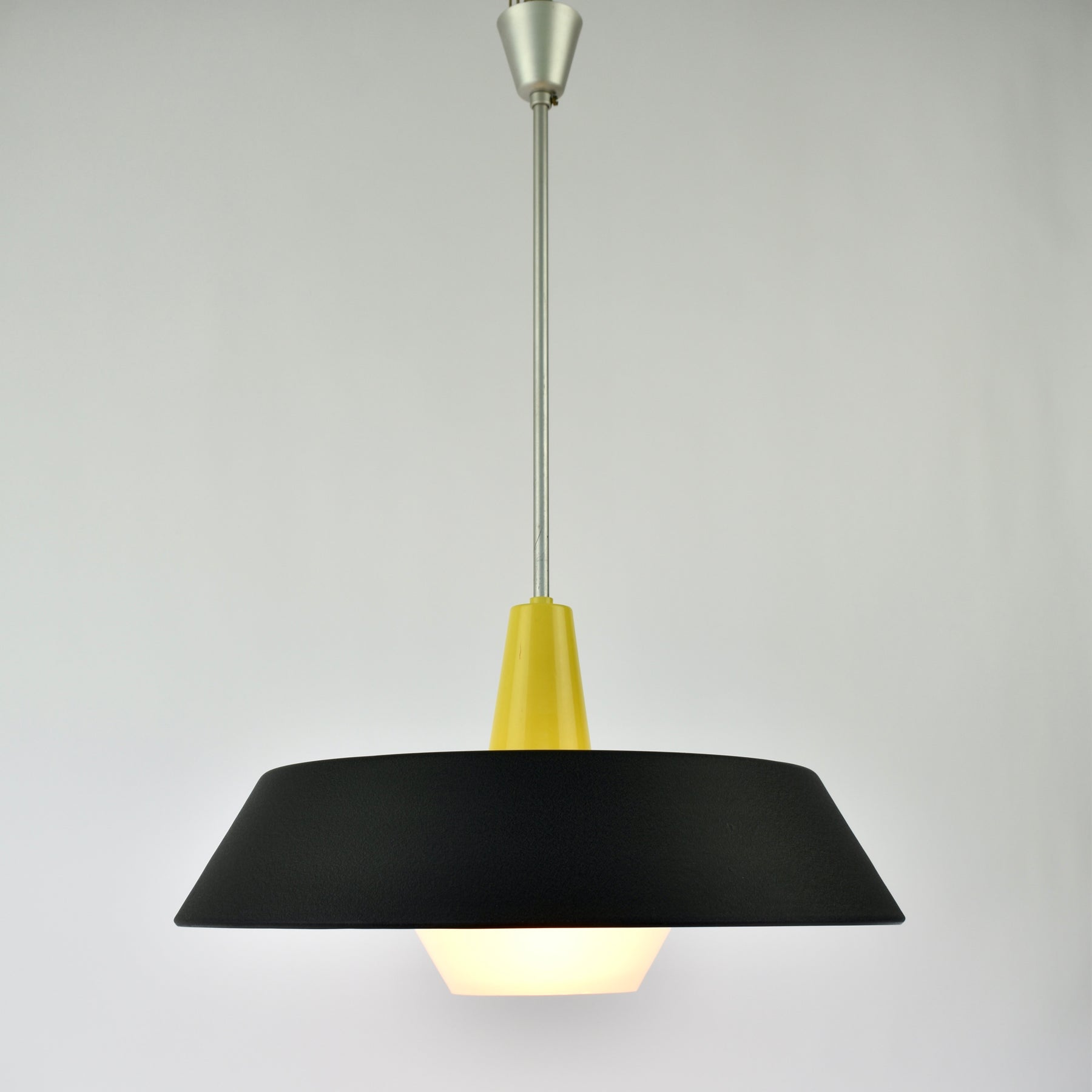 An ingenious feature this light has is the possibility to adjust the position of the lightbulb. The lower the bulb, the more light is caught in the diffuser. The light is in great condition, some very minor traces of wear to the paint. No damage to the plastic diffuser, no dents to the metal, all parts original. The light has been rewired and takes one e26 or e27 fitting size (led) lightbulb.