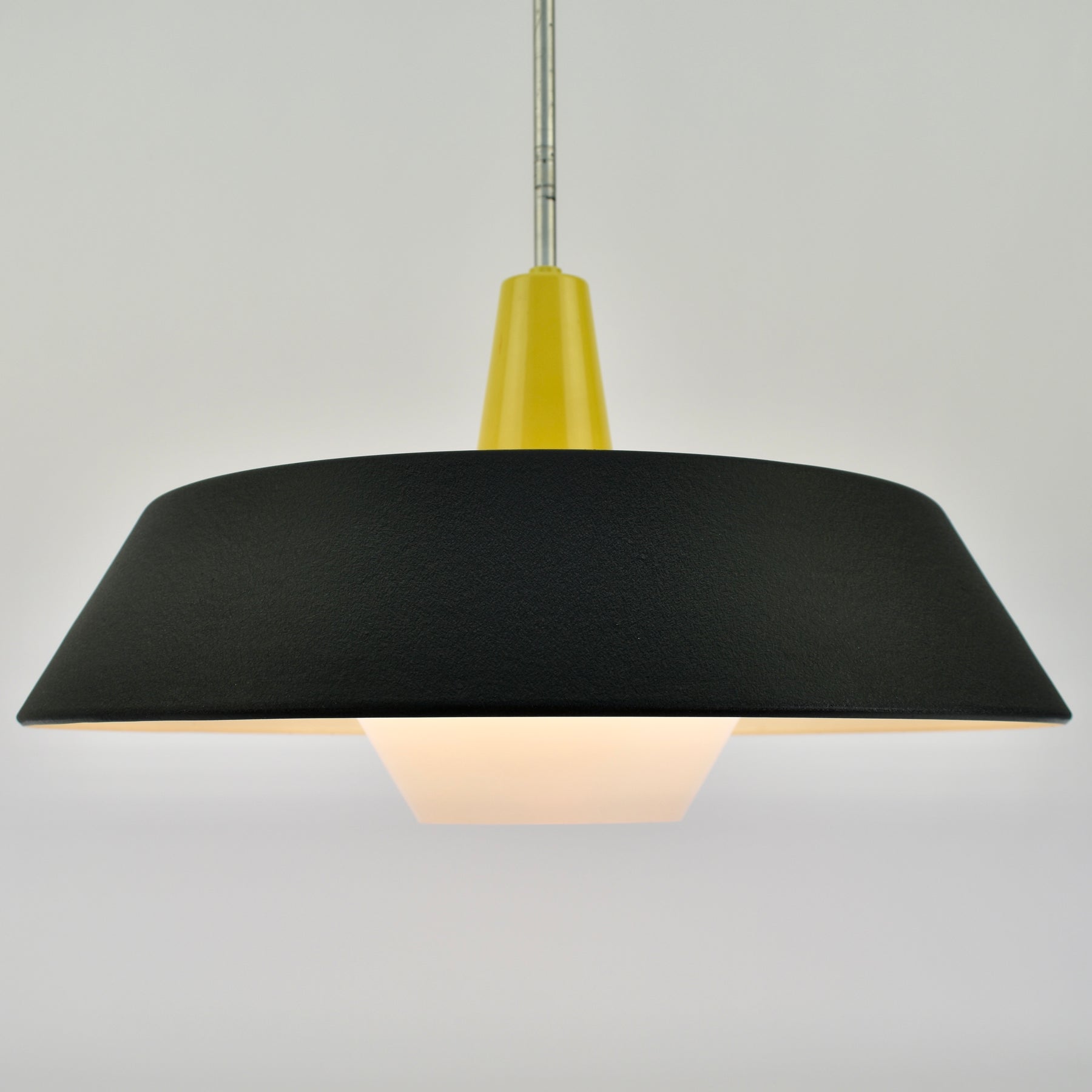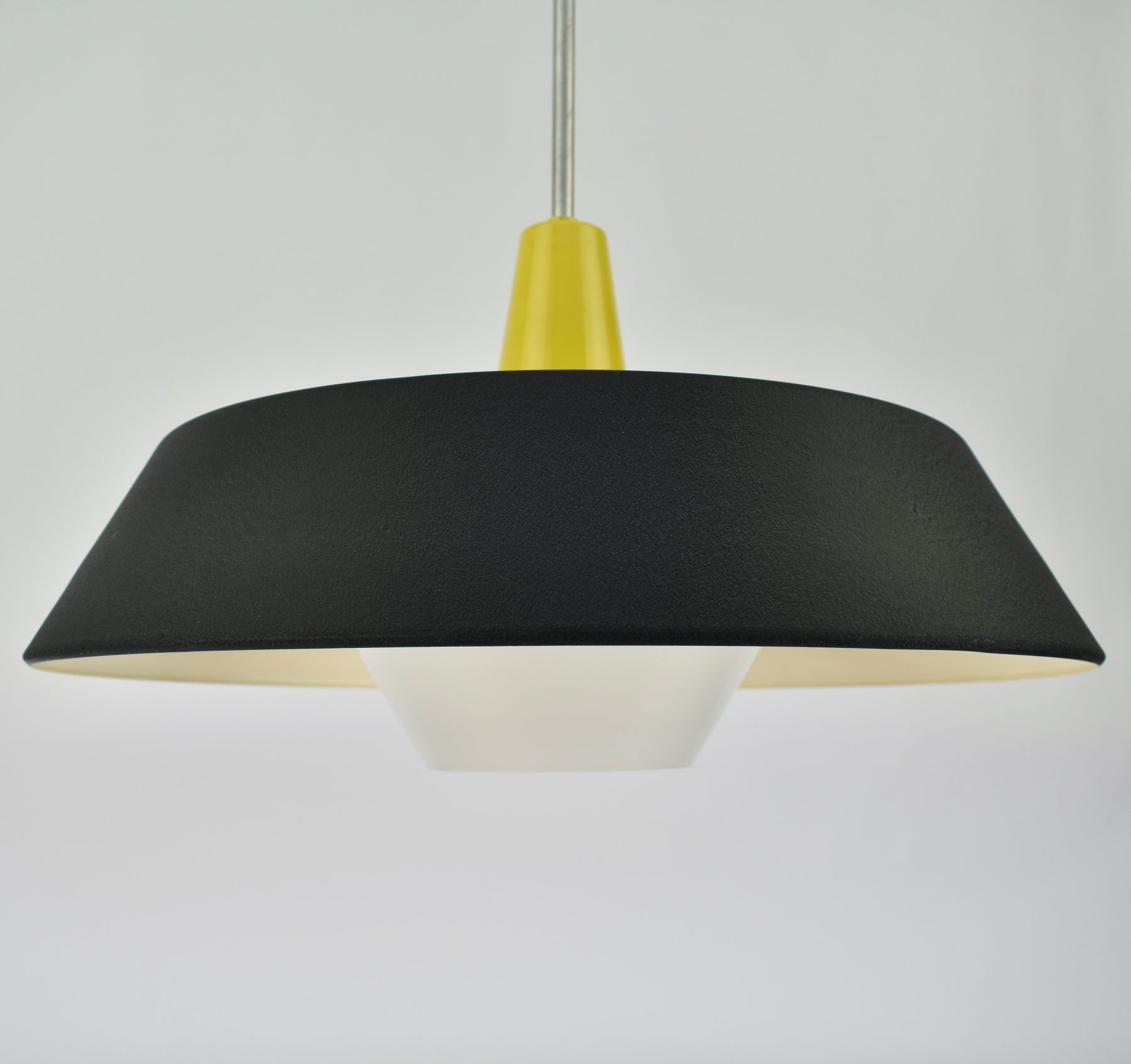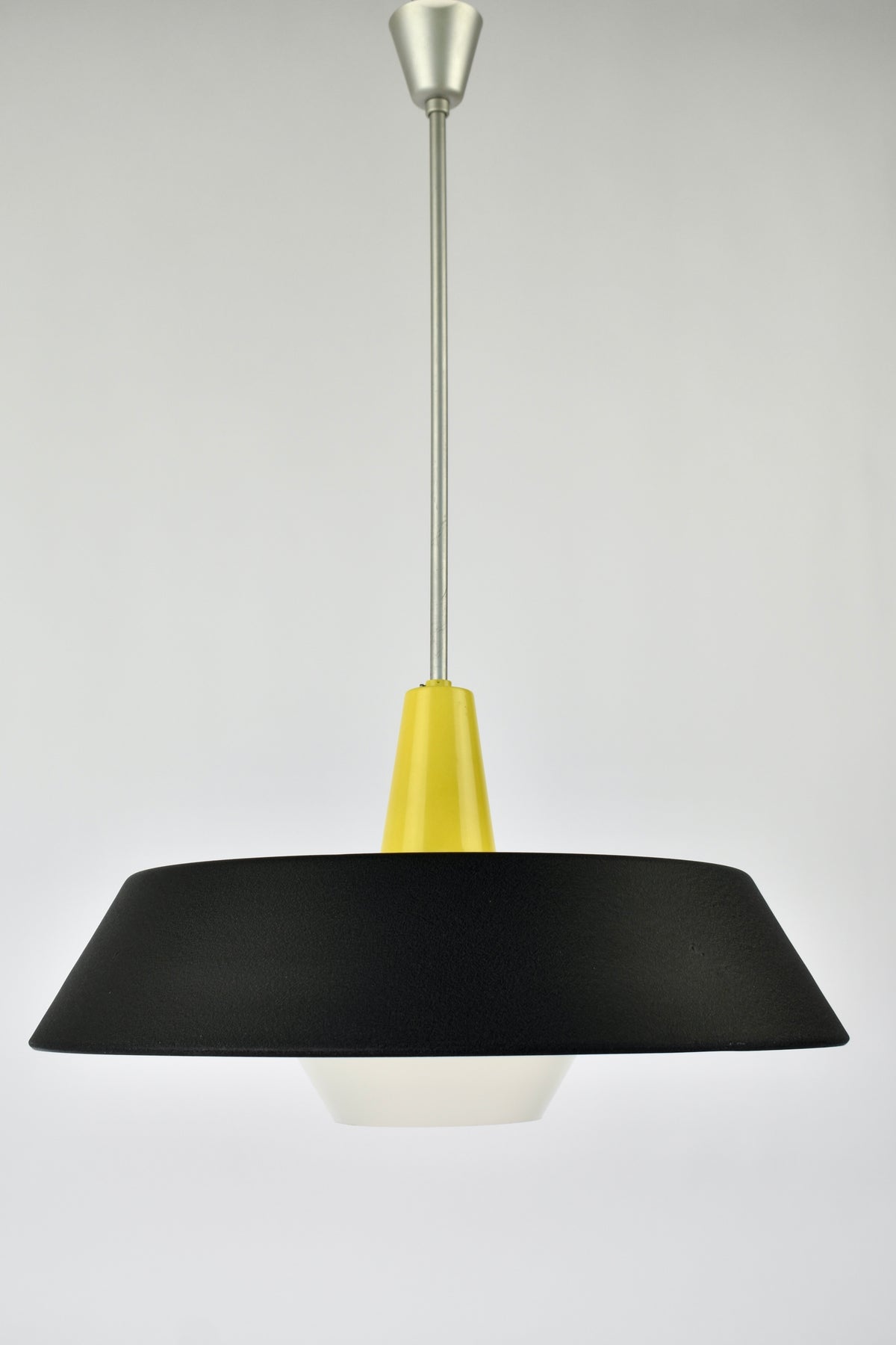 An ingenious feature this light has is the possibility to adjust the position of the lightbulb. The lower the bulb, the more light is caught in the diffuser. The light is in great condition, some very minor traces of wear to the paint. No damage to the plastic diffuser, no dents to the metal, all parts original. The light has been rewired and takes one e26 or e27 fitting size (led) lightbulb.