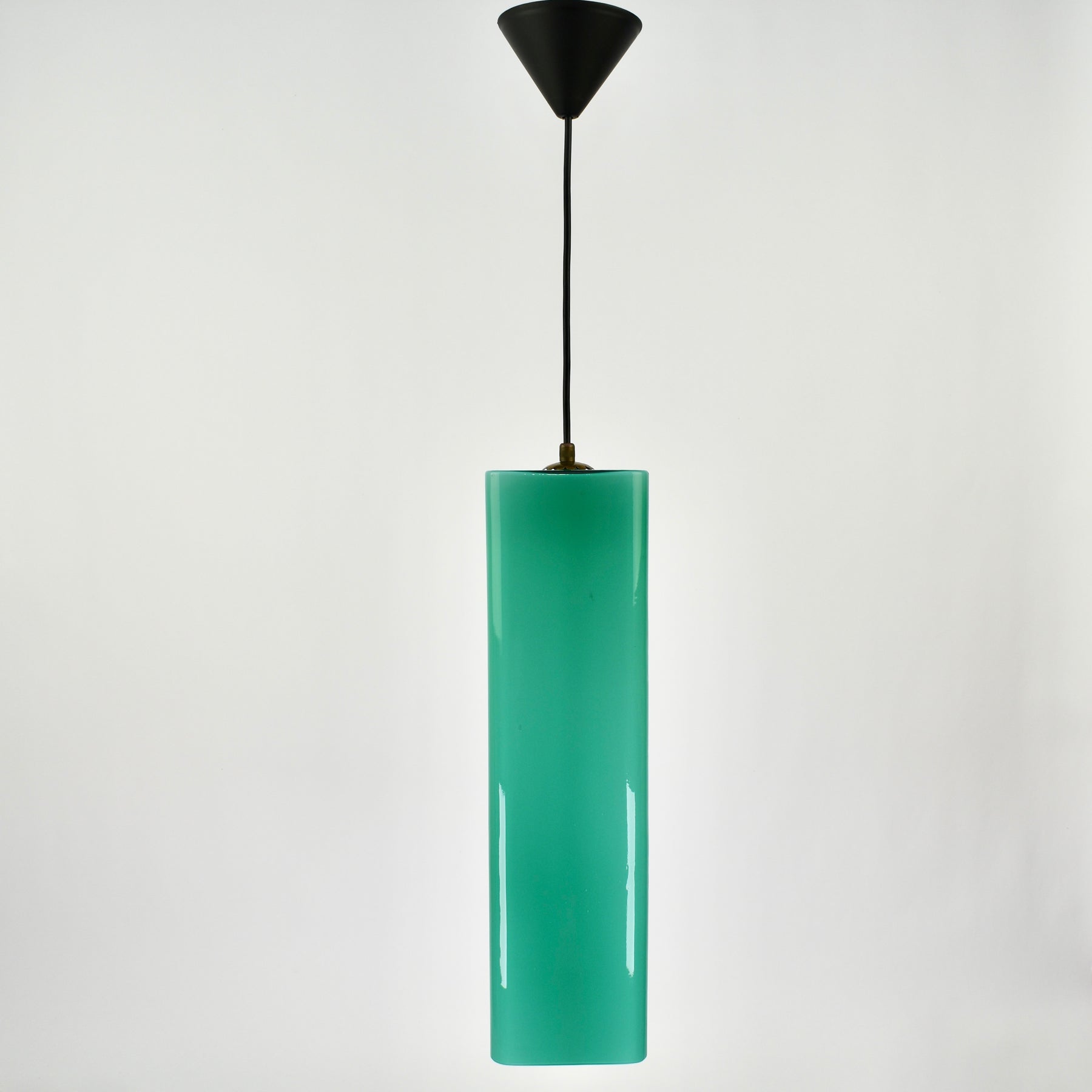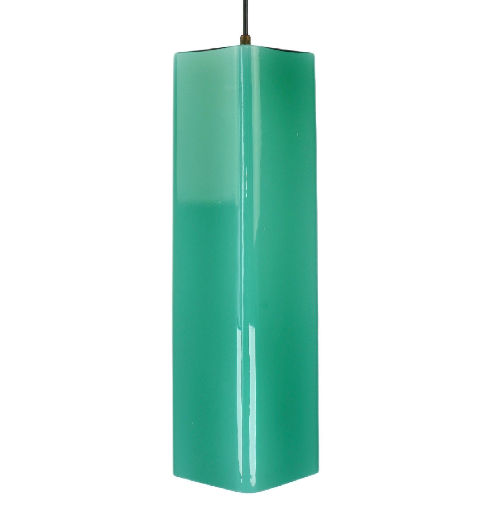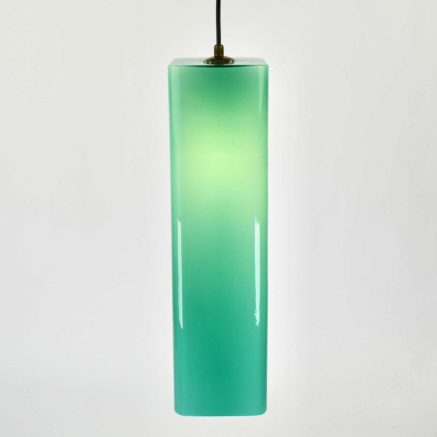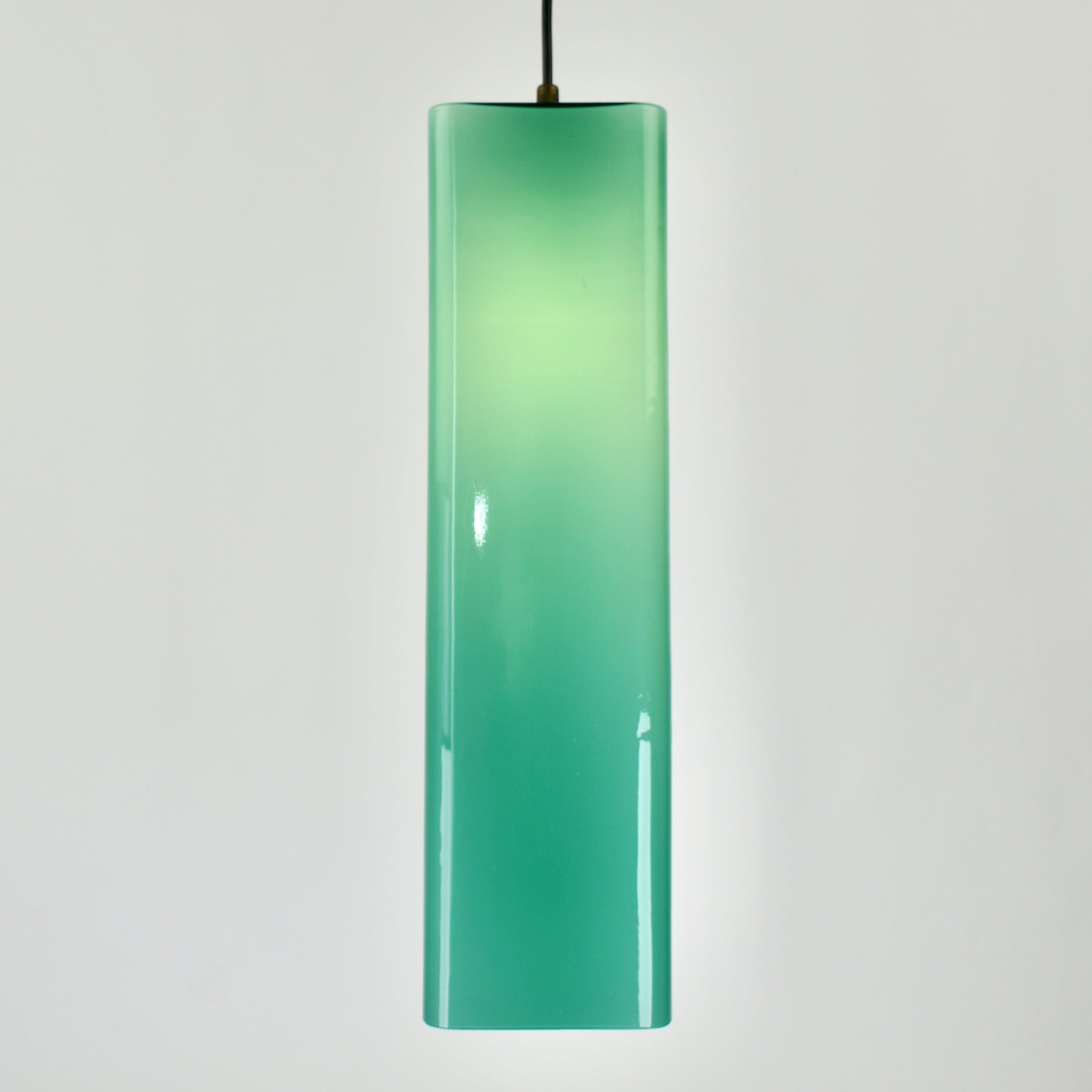 Exceptional Mid-Century Modern pendant light attributed to Gino Vistosi. This light was handcrafted in Murano, Italy around the 1950s.The design features a rectangular tube form in teal green Murano glass, showcasing the clarity and color typical of Italian glassmaking from this period.