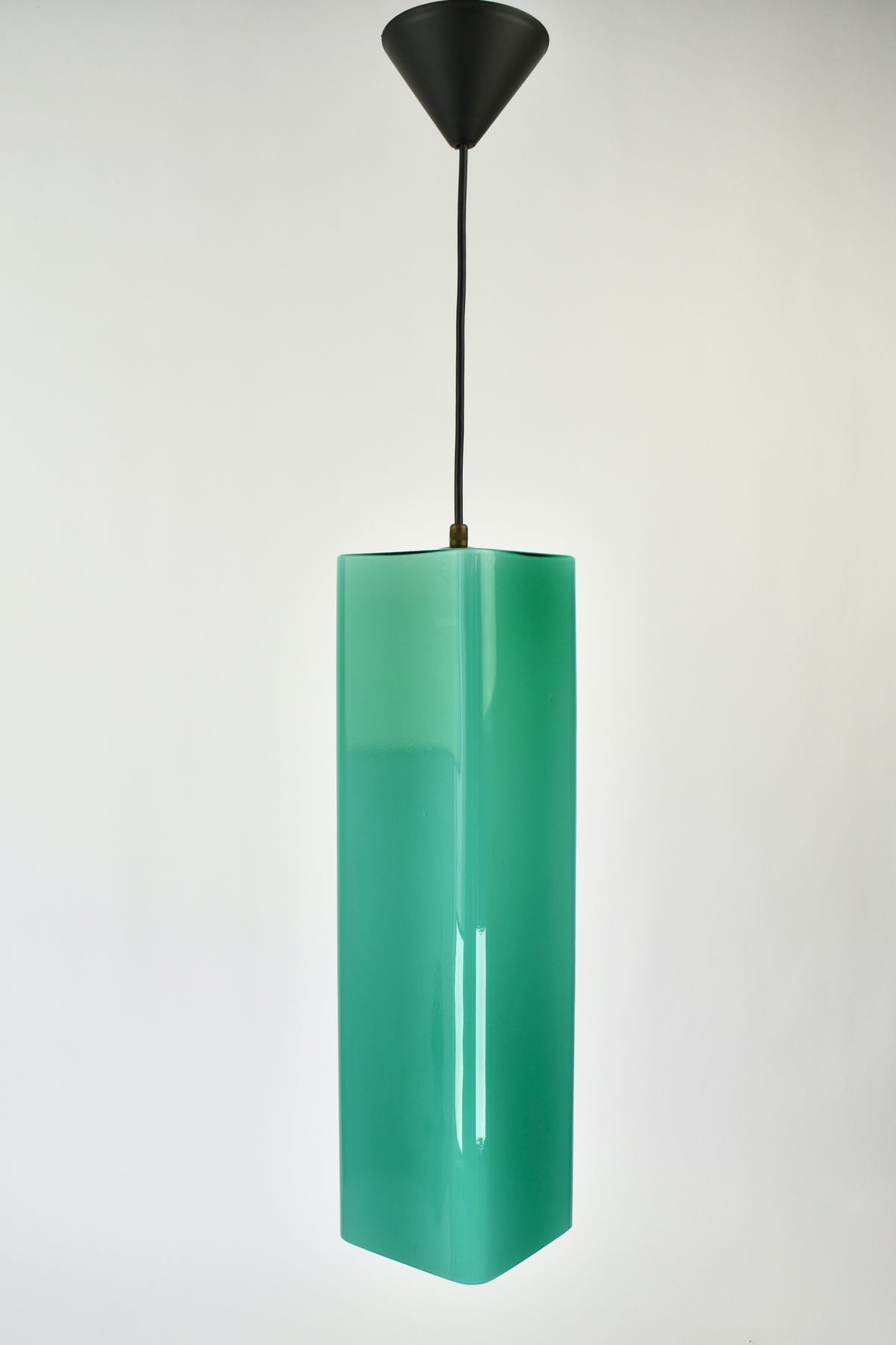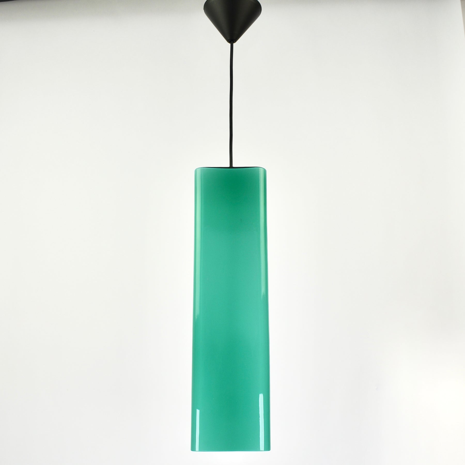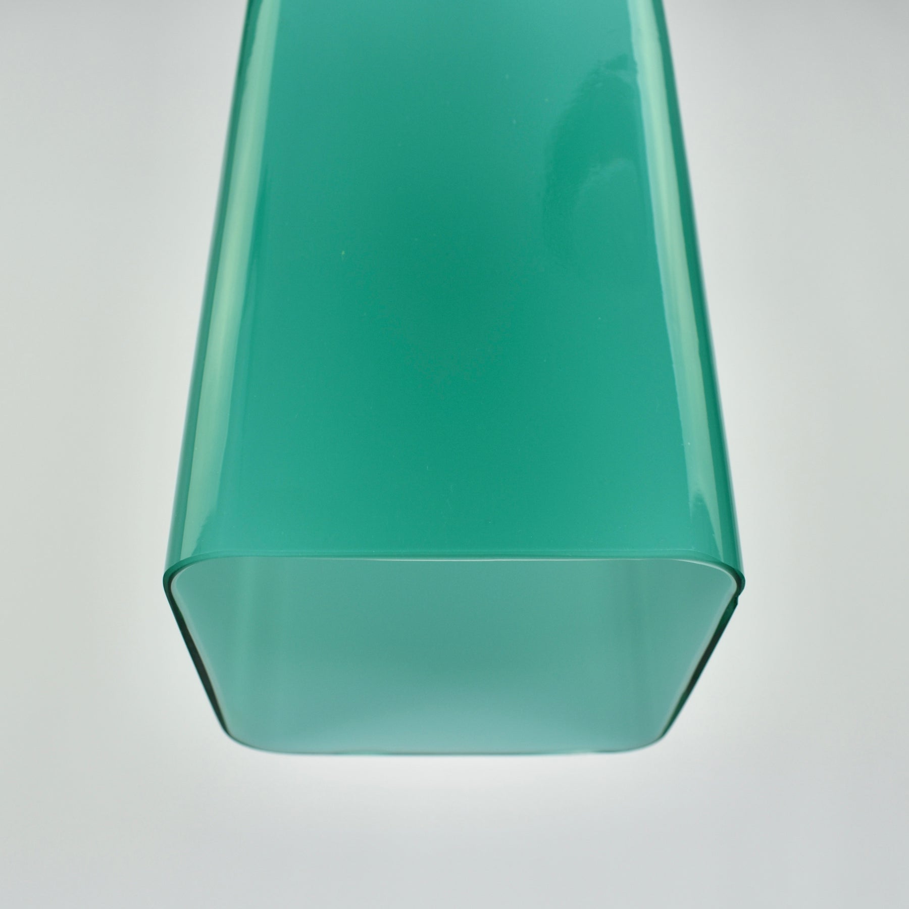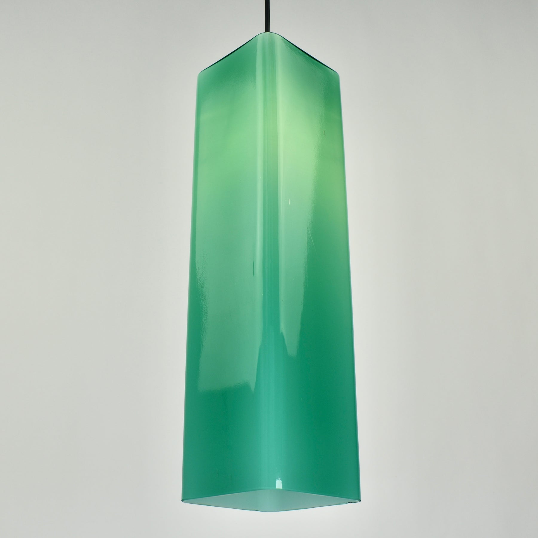 Exceptional Mid-Century Modern pendant light attributed to Gino Vistosi. This light was handcrafted in Murano, Italy around the 1950s.The design features a rectangular tube form in teal green Murano glass, showcasing the clarity and color typical of Italian glassmaking from this period.
