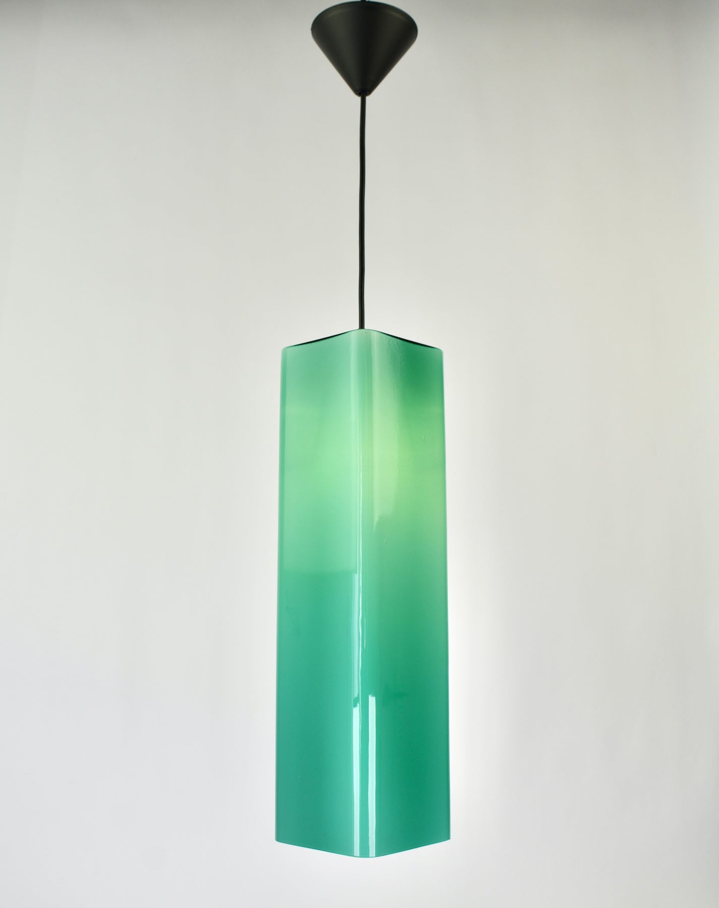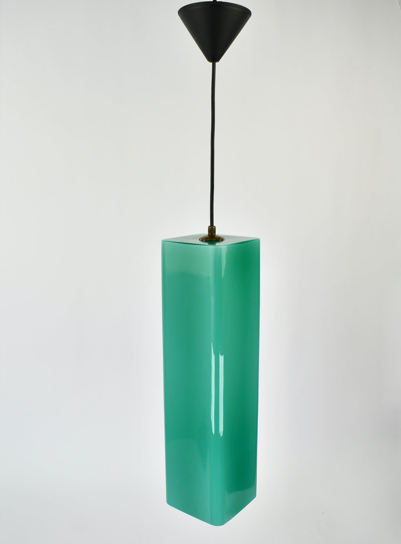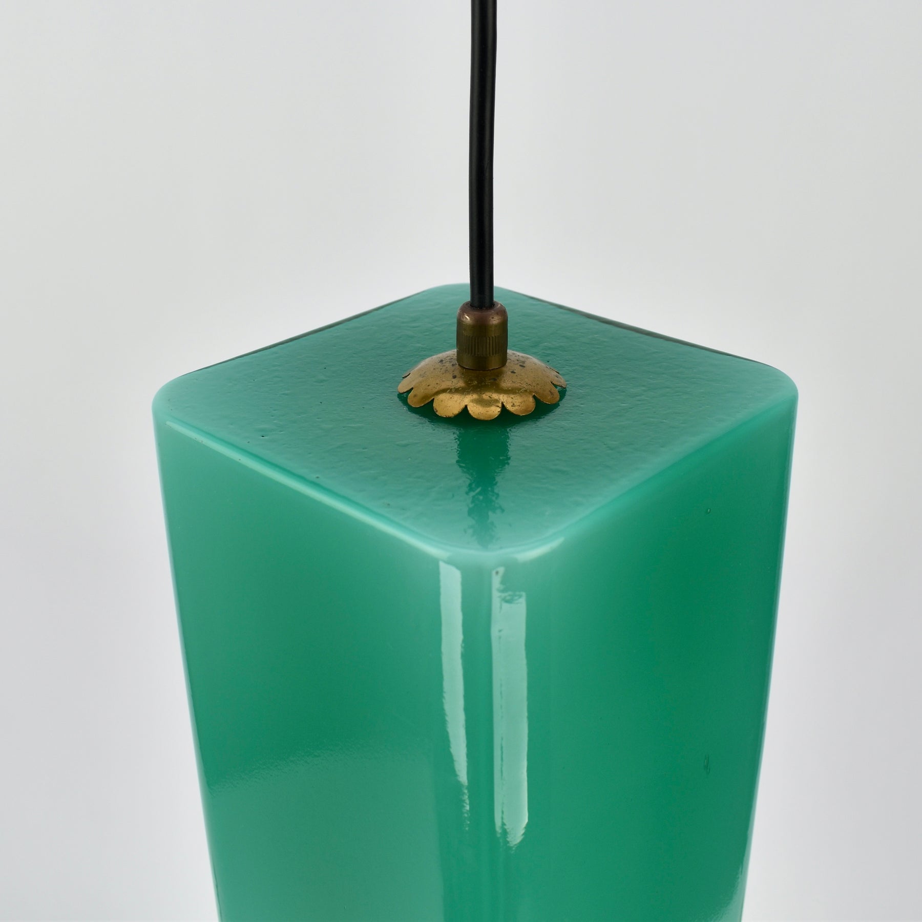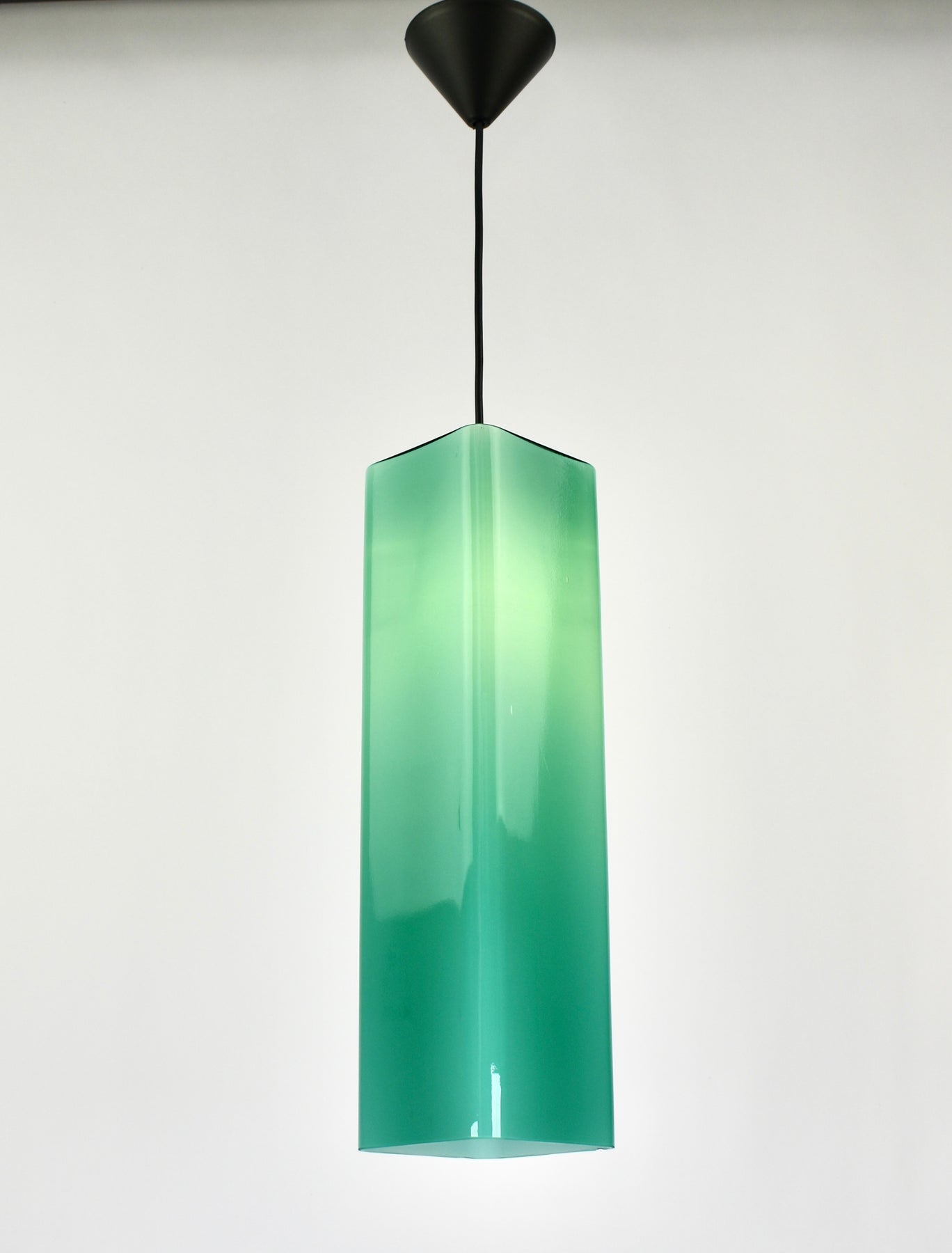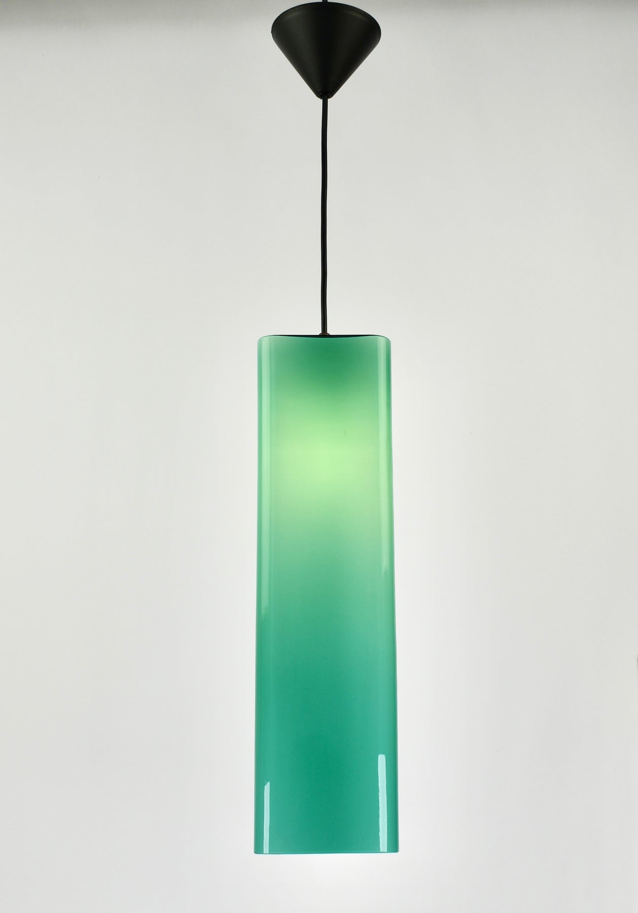 Exceptional Mid-Century Modern pendant light attributed to Gino Vistosi. This light was handcrafted in Murano, Italy around the 1950s.The design features a rectangular tube form in teal green Murano glass, showcasing the clarity and color typical of Italian glassmaking from this period.