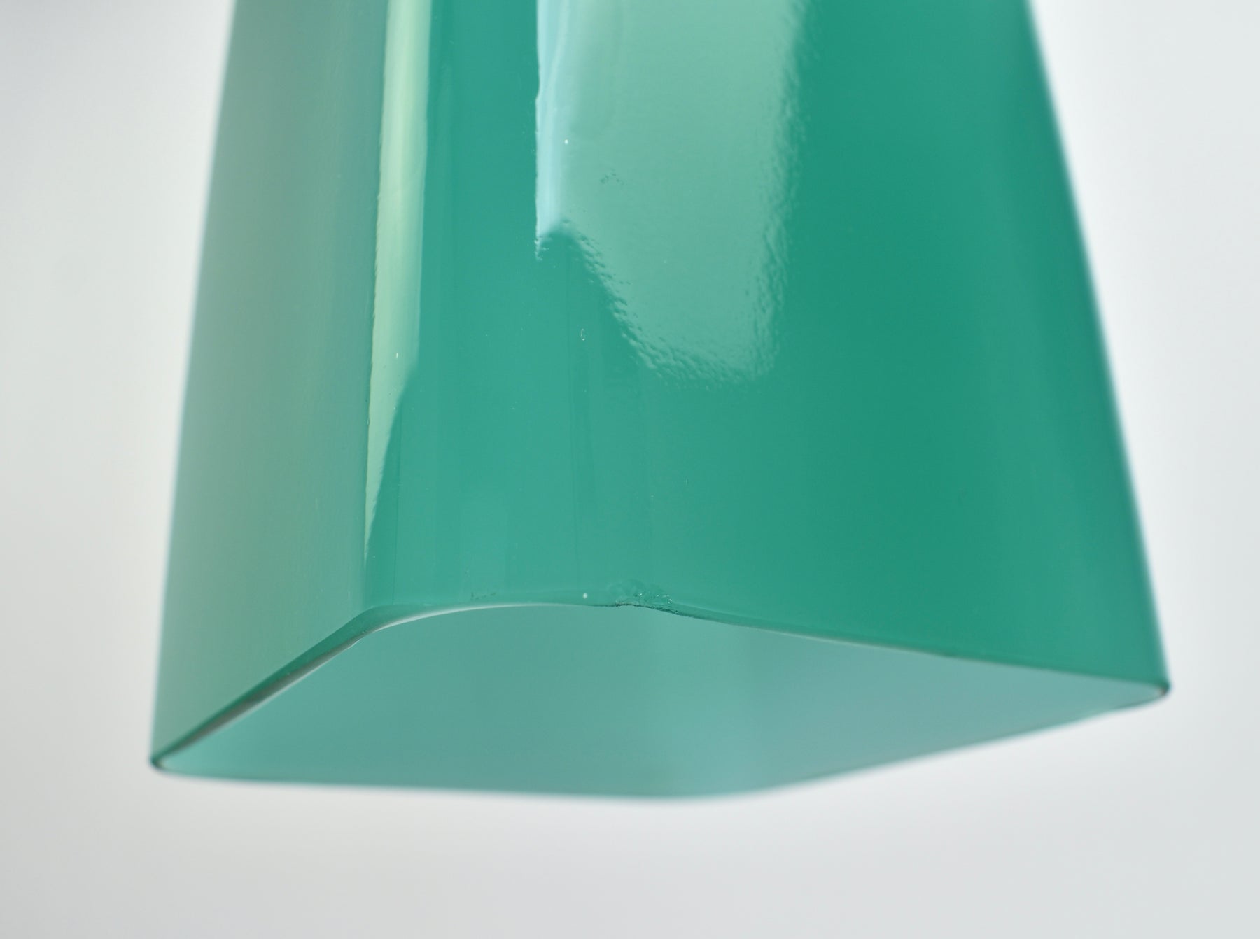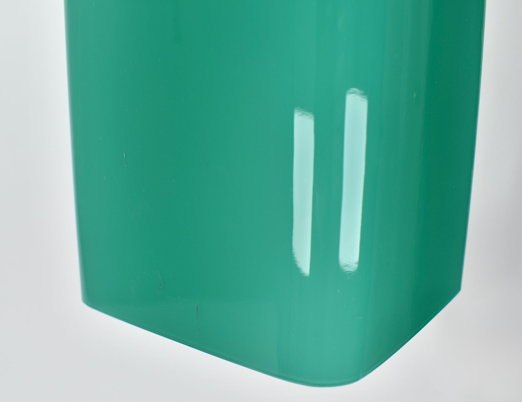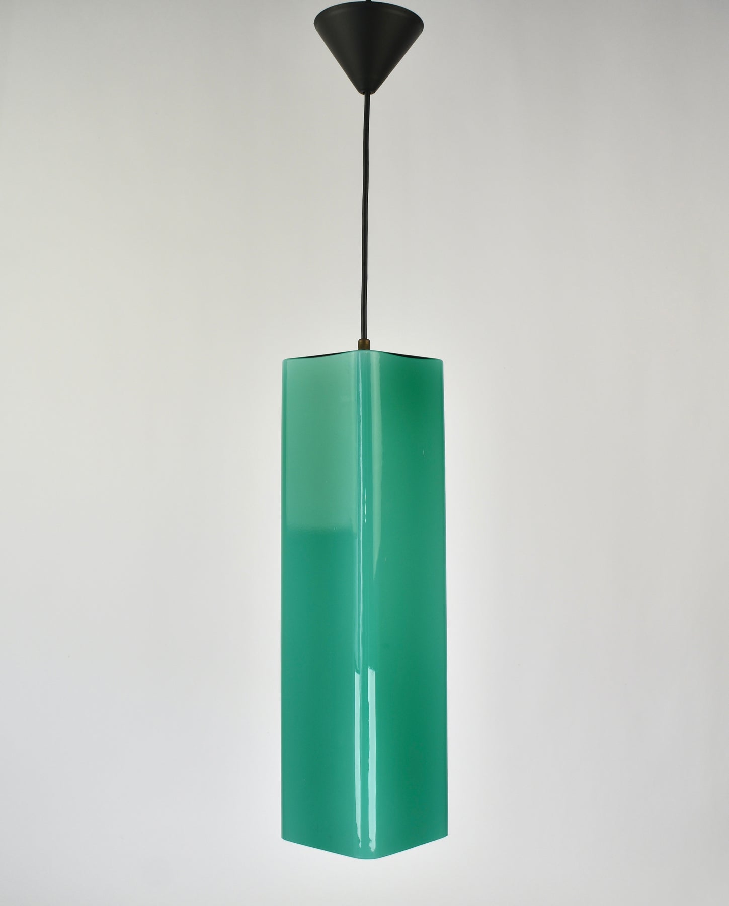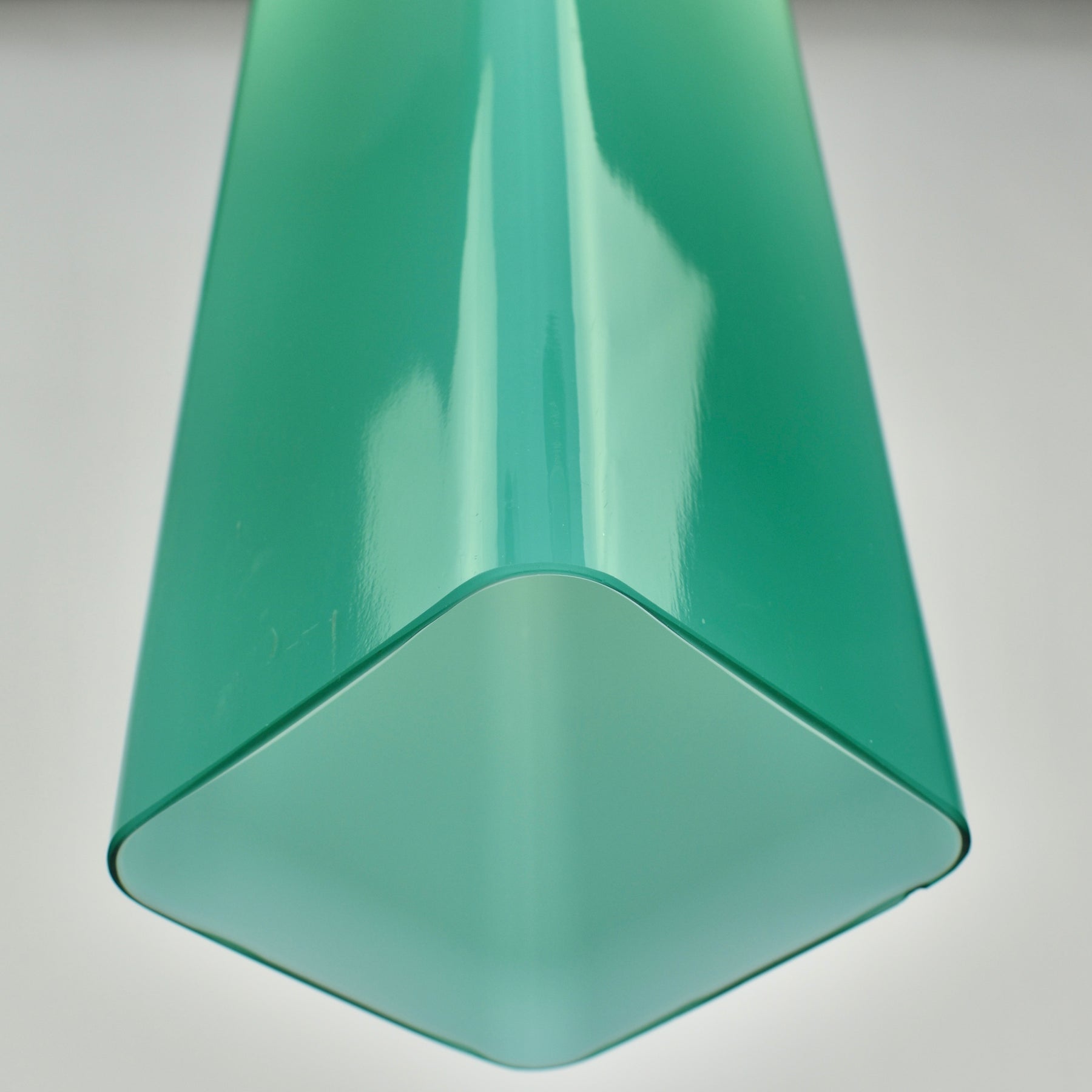 Exceptional Mid-Century Modern pendant light attributed to Gino Vistosi. This light was handcrafted in Murano, Italy around the 1950s.The design features a rectangular tube form in teal green Murano glass, showcasing the clarity and color typical of Italian glassmaking from this period.