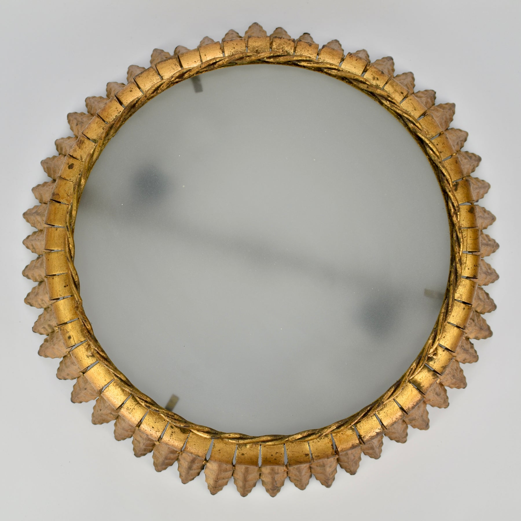 Beautiful 1950s gilded iron flush mount, made in Spain. The frosted glass diffuses the light in a beautiful way. The light has 2 light points, all take an e26 or e27 fitting size lightbulbs. Suitable for led, or edison bulbs. Great vintage condition, wiring has been checked.
