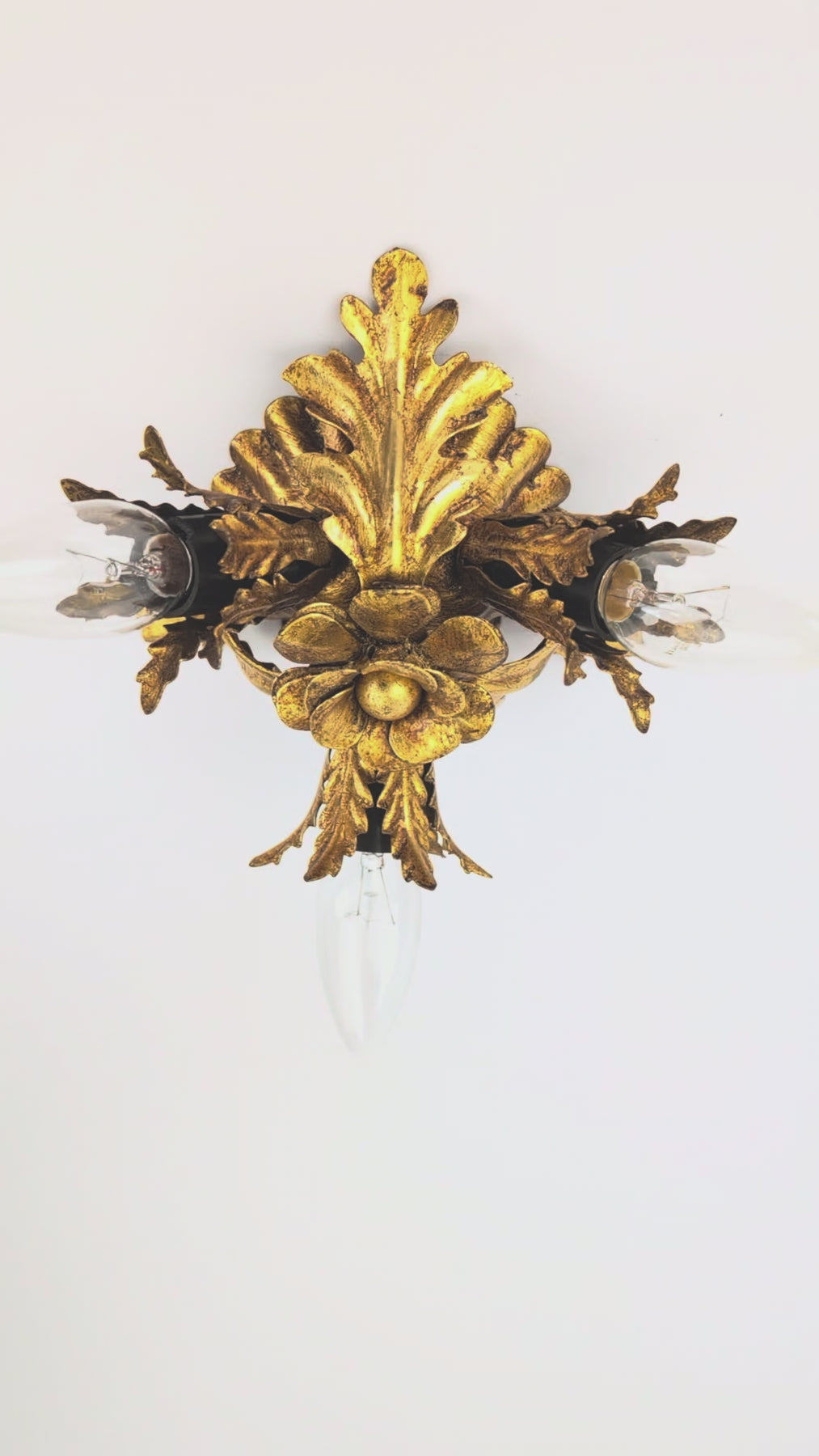 Superb Italian flush mount or wall sconce by Banci Firenze, Italy. The lamp has three lights (E14 fitting) and is covered with gold leaf. The lamp is in great vintage condition, only minor traces of wear.