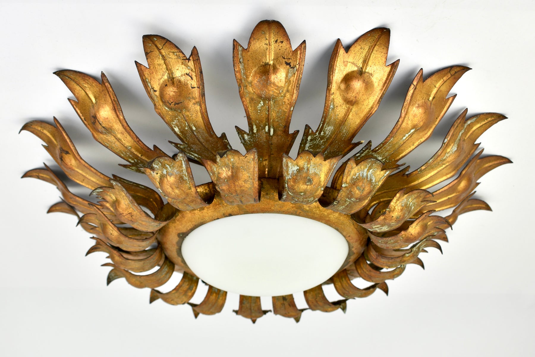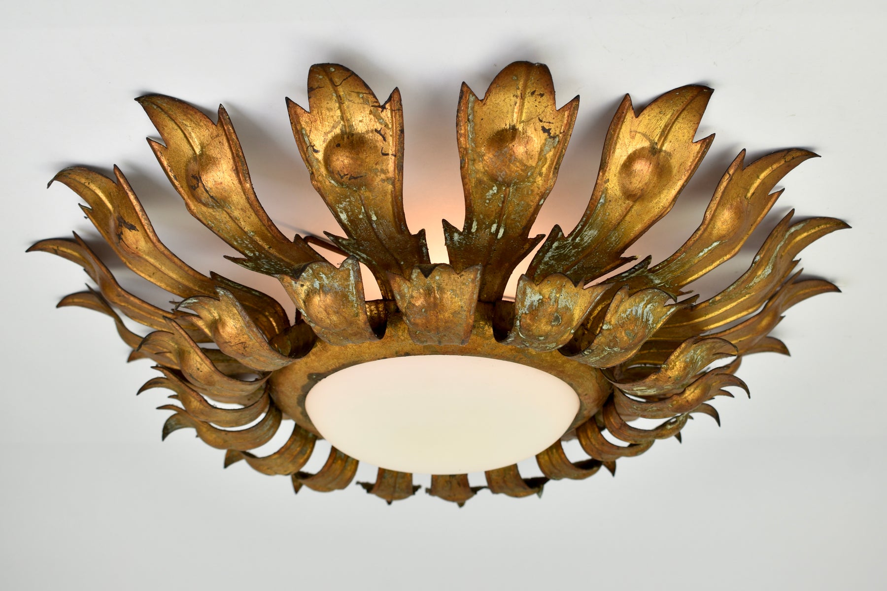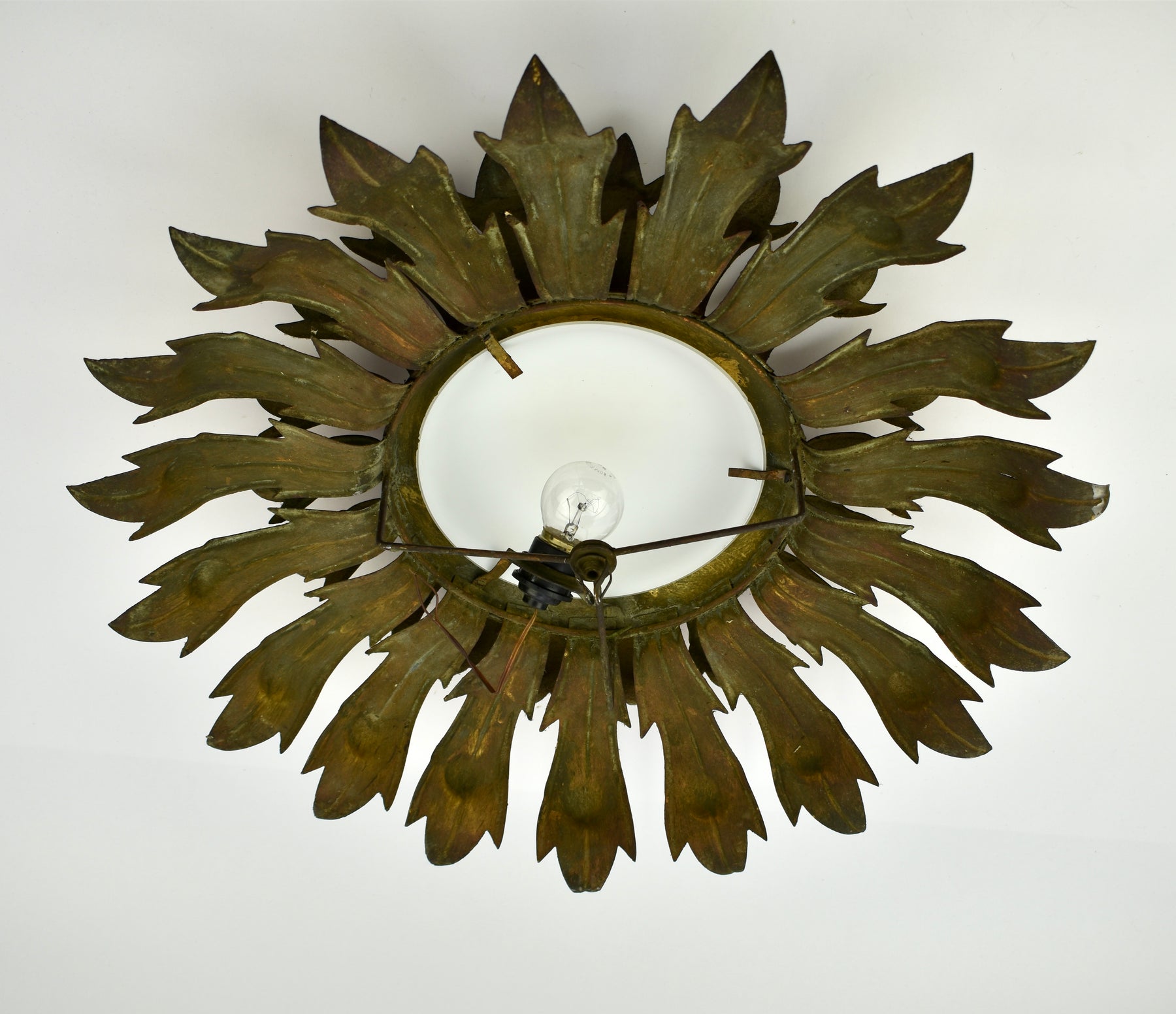 Beautiful 1950s gilded iron flush mount, made in Spain. The gilded metal has a stunning green patina, rare find in this condition. The convex satined white glass diffuses the light in a beautiful way. The light takes one e14 fitting size lightbulbs. Suitable for led, or edison bulbs. Great vintage condition, wiring has been checked.