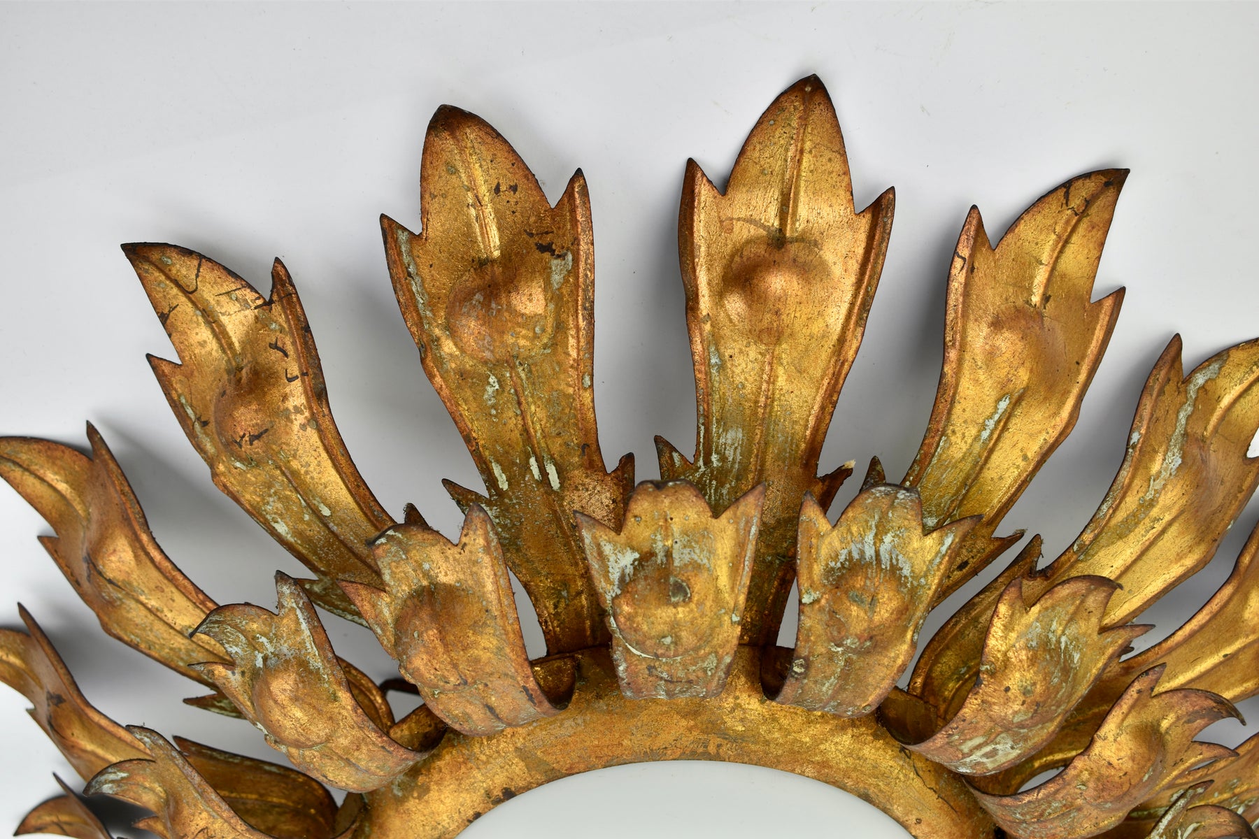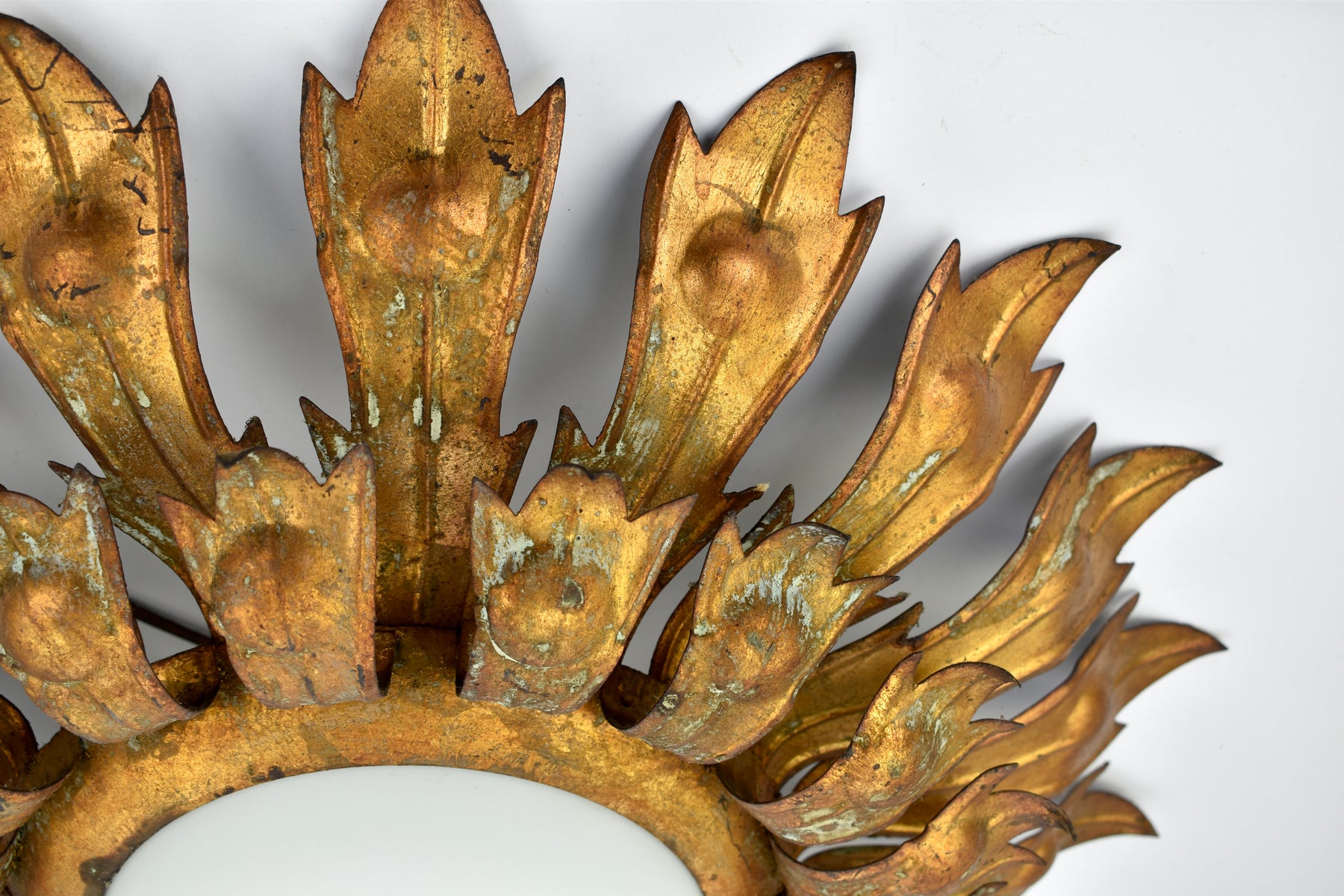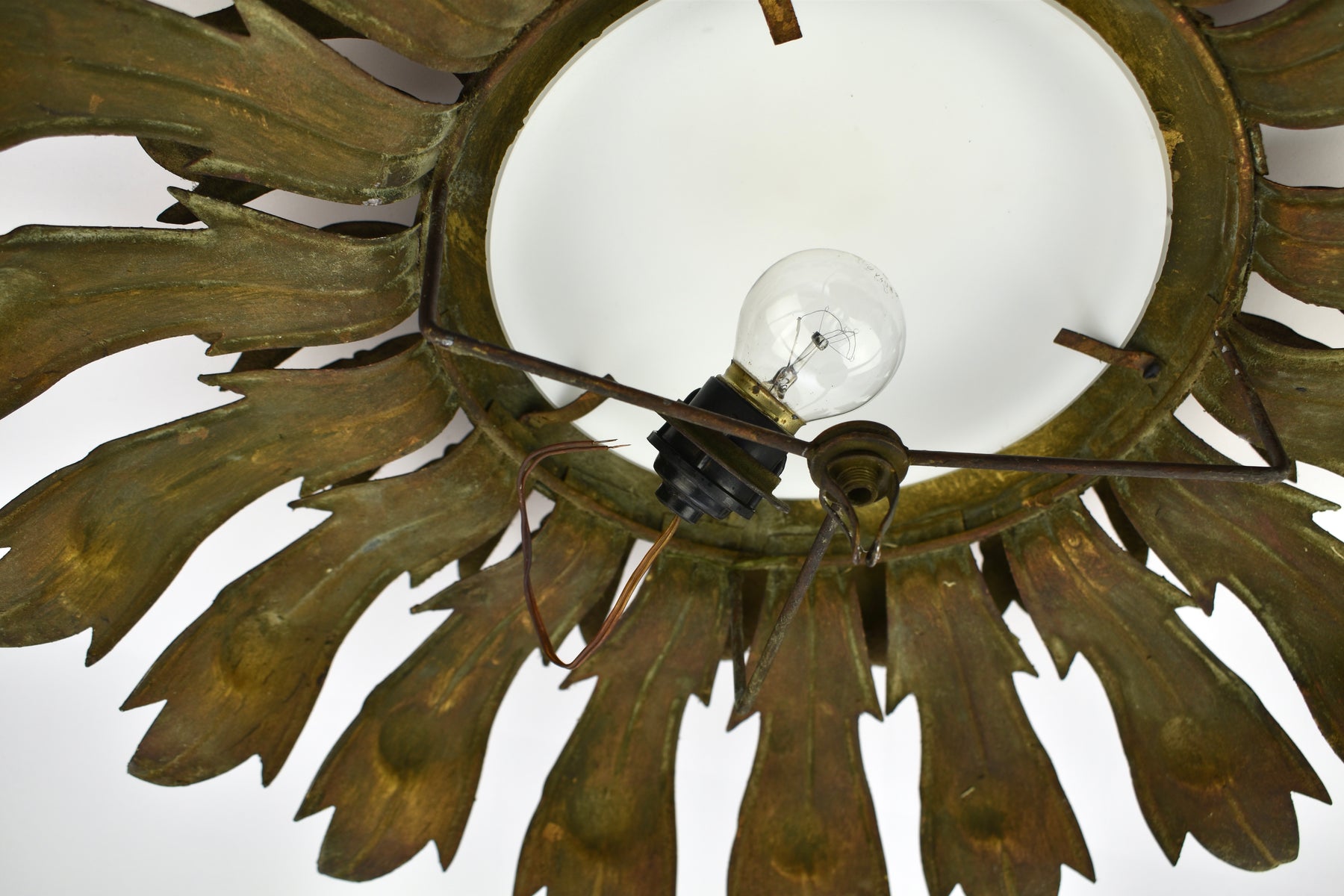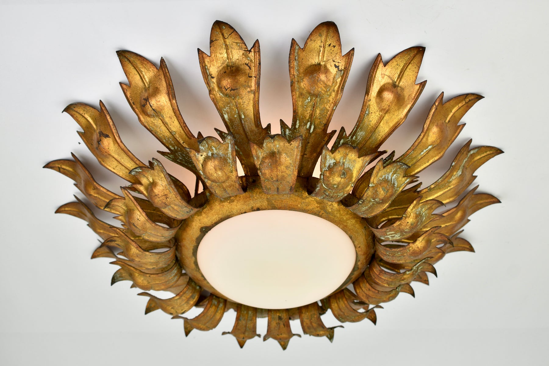 Beautiful 1950s gilded iron flush mount, made in Spain. The gilded metal has a stunning green patina, rare find in this condition. The convex satined white glass diffuses the light in a beautiful way. The light takes one e14 fitting size lightbulbs. Suitable for led, or edison bulbs. Great vintage condition, wiring has been checked.