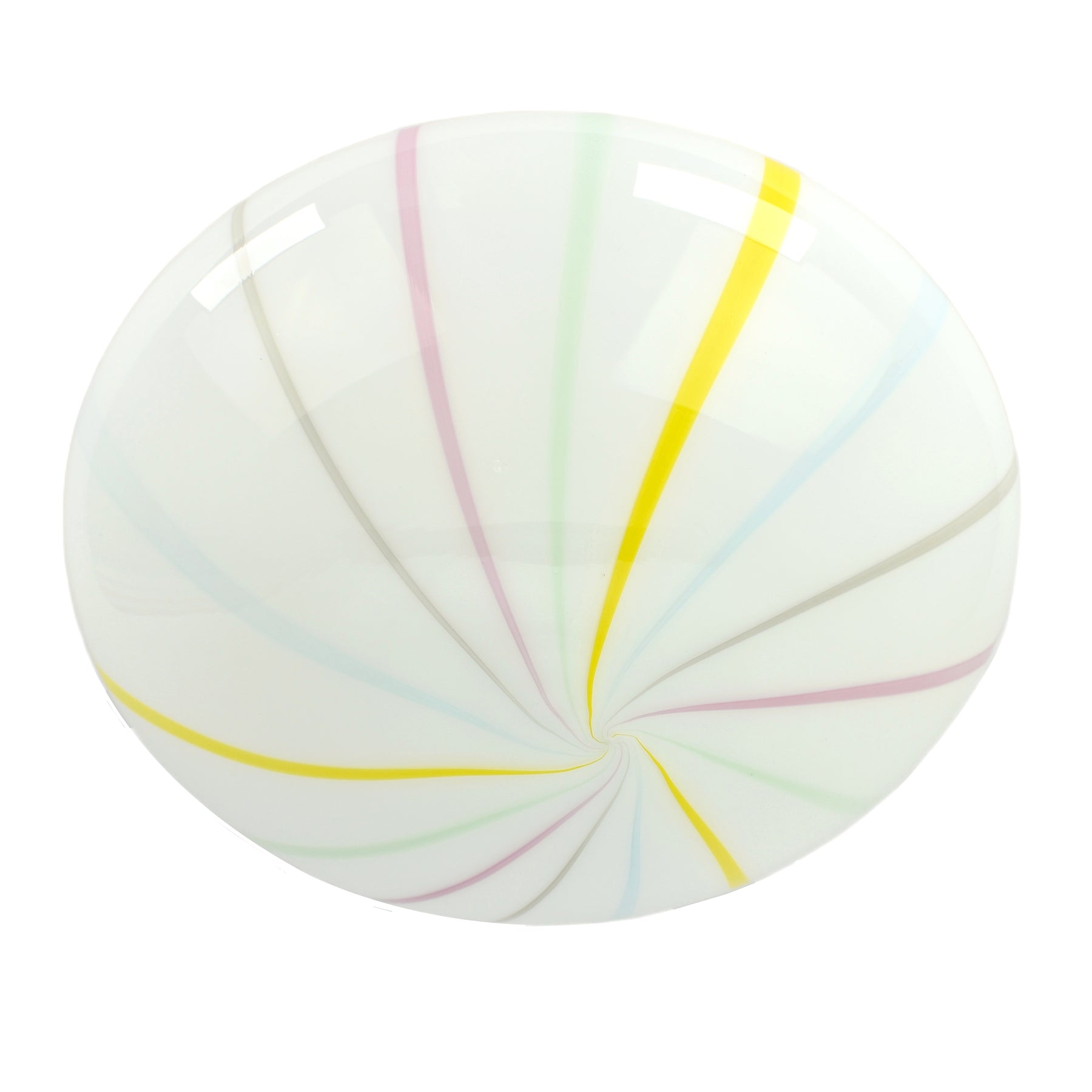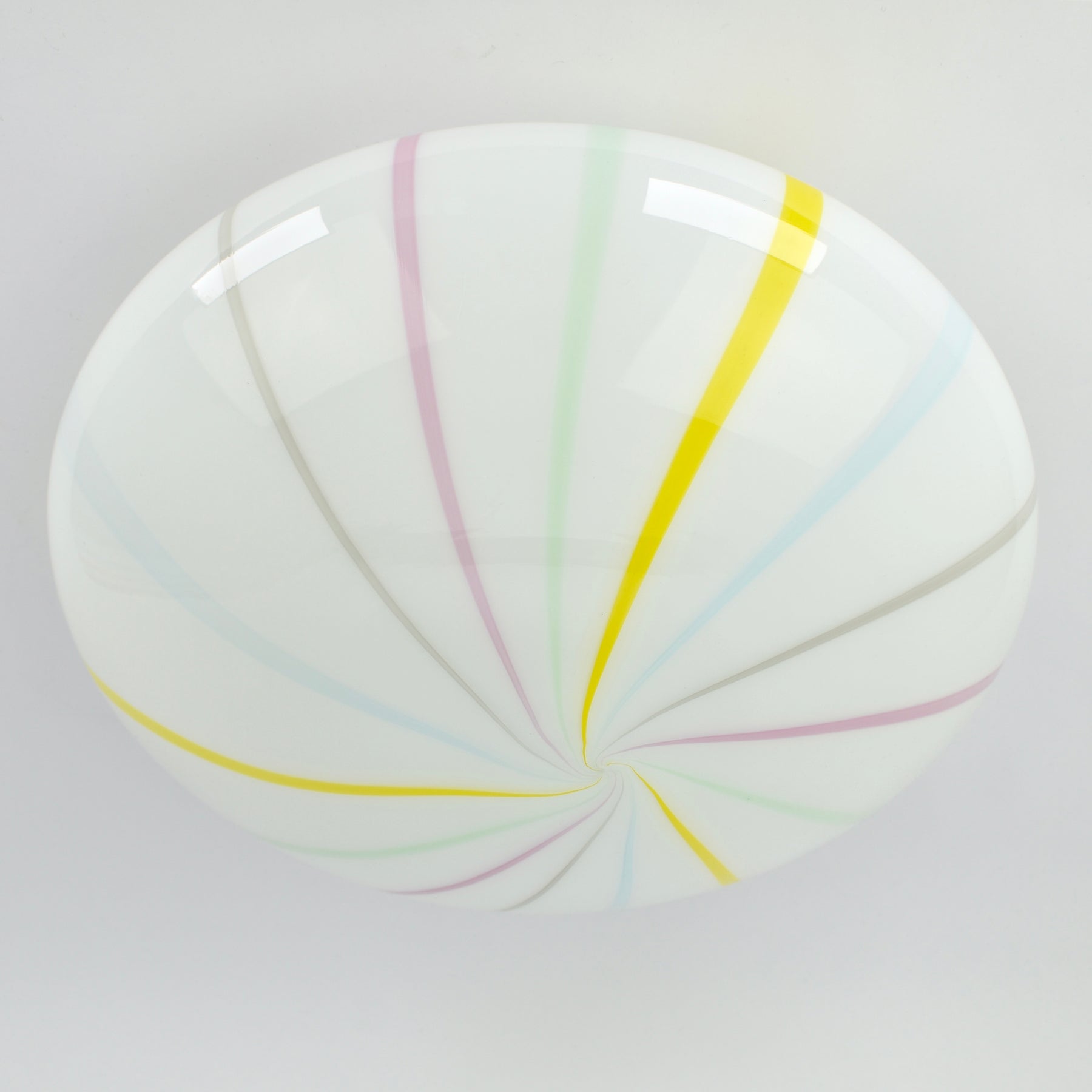 Stunning Mid-Century Murano glass flush light, featuring an eye-catching pastel striped swirl design. Handblown in Italy, this piece captures the timeless style of Venini and Vignelli. The lamp takes one e26 or e27 fitting size lightbulb. Glass is in great undamaged condition. Some wear to the metal base. The light has been rewired.